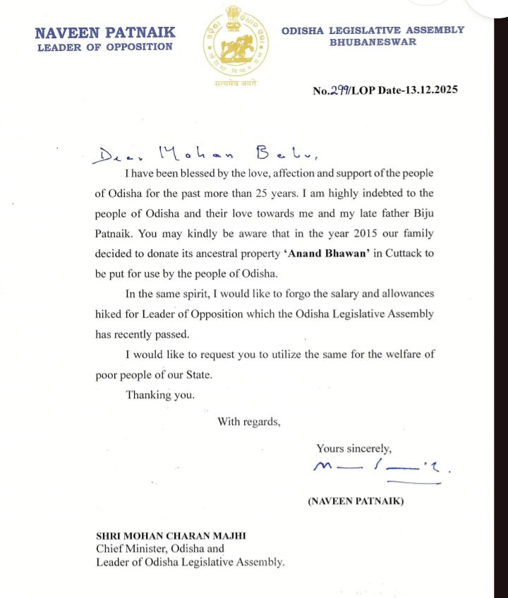 ଭୁବନେଶ୍ୱର (ରାଜ୍ୟକାହାଣୀ )ମୁଖ୍ୟମନ୍ତ୍ରୀଙ୍କୁ ଚିଠି ଲେଖିଲେ ବିରୋଧୀ ଦଳ ନେତା ନବୀନ ପଟ୍ଟନାୟକ। ବର୍ଦ୍ଧିତ ଦରମାକୁ ଗରିବଙ୍କୁ ଦାନ କରିବେ ନବୀନ ପଟ୍ଟନାୟକ। ଏନେଇ ମୁଖ୍ୟମନ୍ତ୍ରୀଙ୍କୁ ଚିଠି ଲେଖିଛନ୍ତି। ଚିଠିରେ ନବୀନ ଲେଖିଛନ୍ତି ଯେ ଗରିବ ଲୋକଙ୍କ ବିକାଶ ପାଇଁ ଖର୍ଚ୍ଚ ହେଉ ମୋ ଟଙ୍କା।